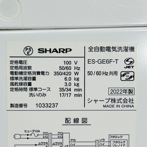 ♦️SHARP a3665 洗濯機 6.0kg 2022年製 9♦️